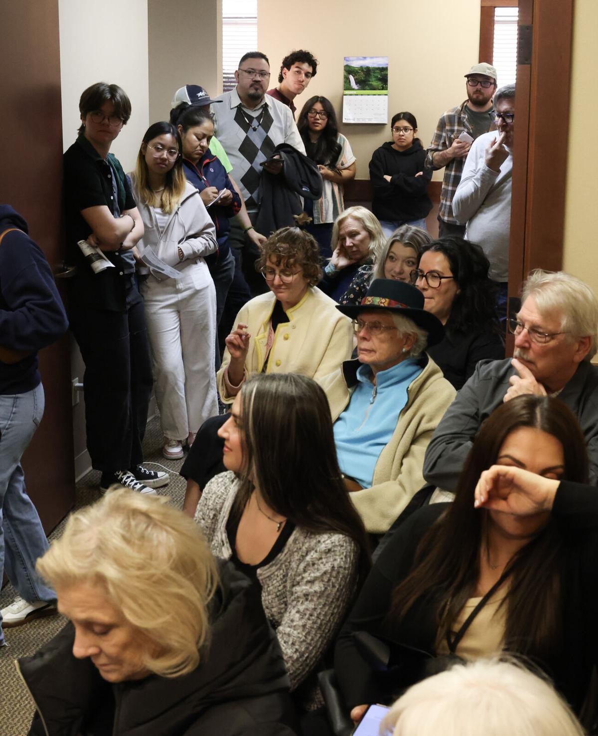 People watch and listen to a public hearing concerning a proposed biomethane plant in Sunnyside from the hallway TUesday, March 25, 2026, at Yakima Regional Clean Air Agency office in Yakima, Wash. Evan Abell / Yakima Herald-Republic